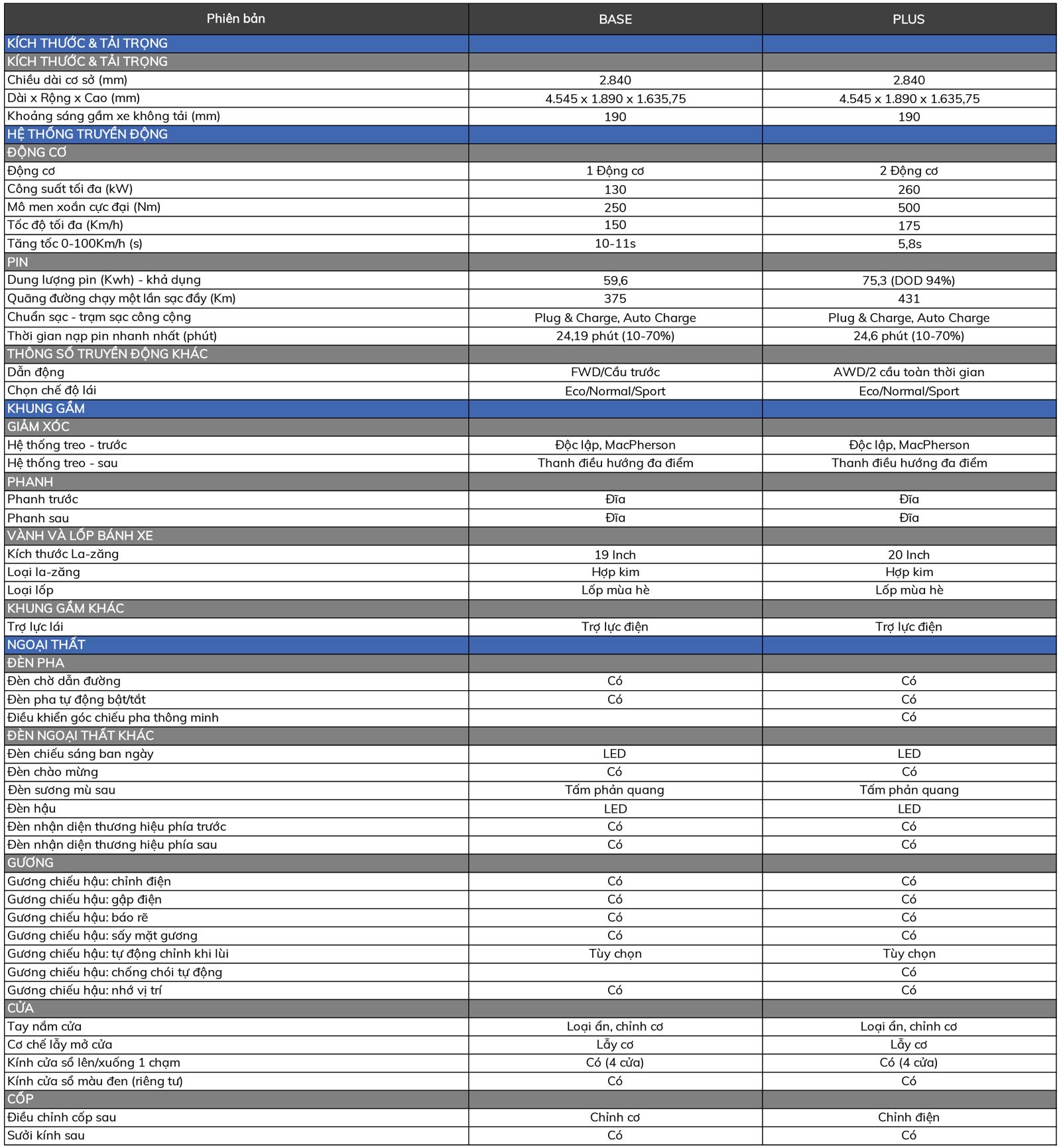 - Tăng tốc 0-100Km/h (s): 10 – 11s (base) | 5,8s (Plus)