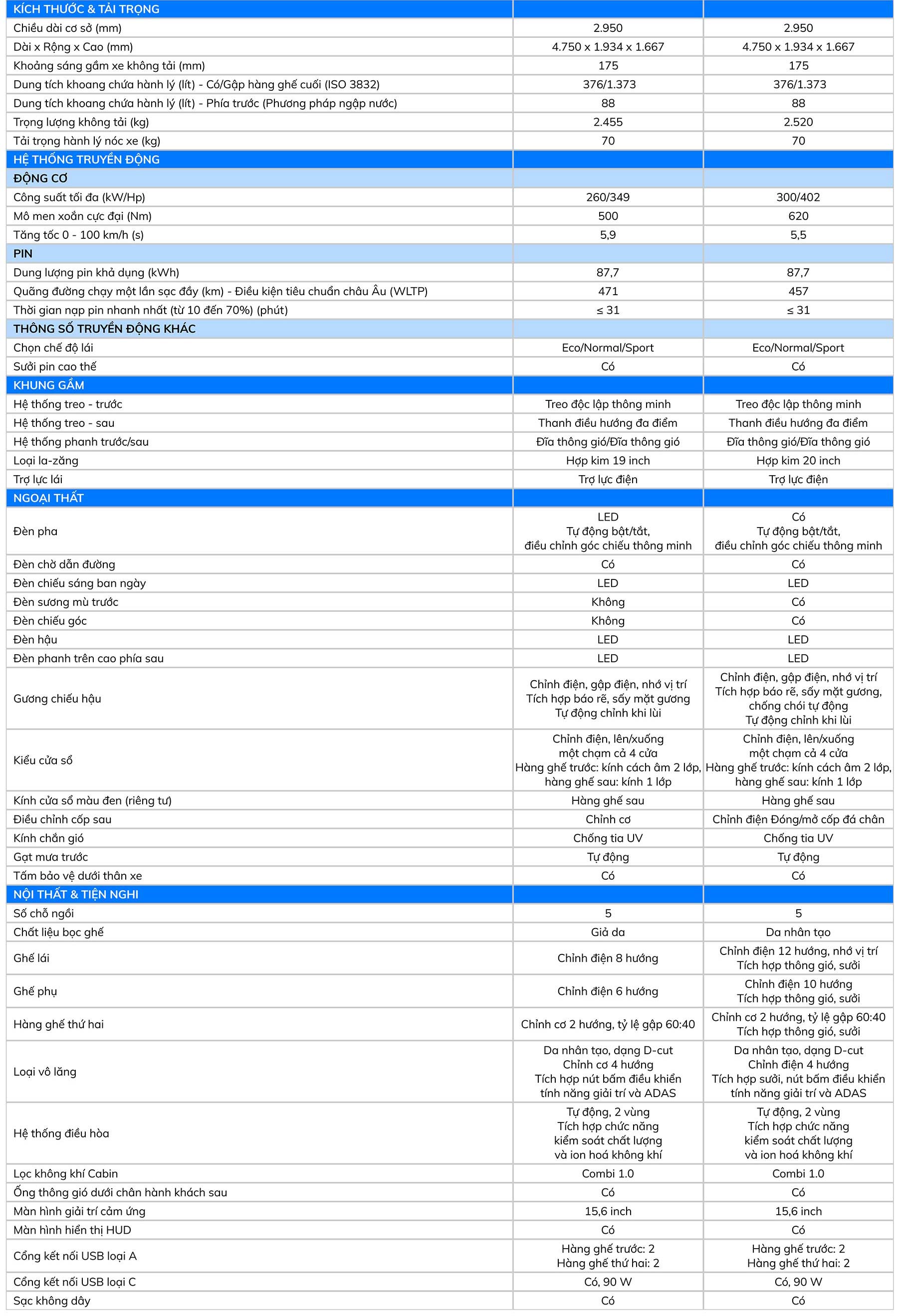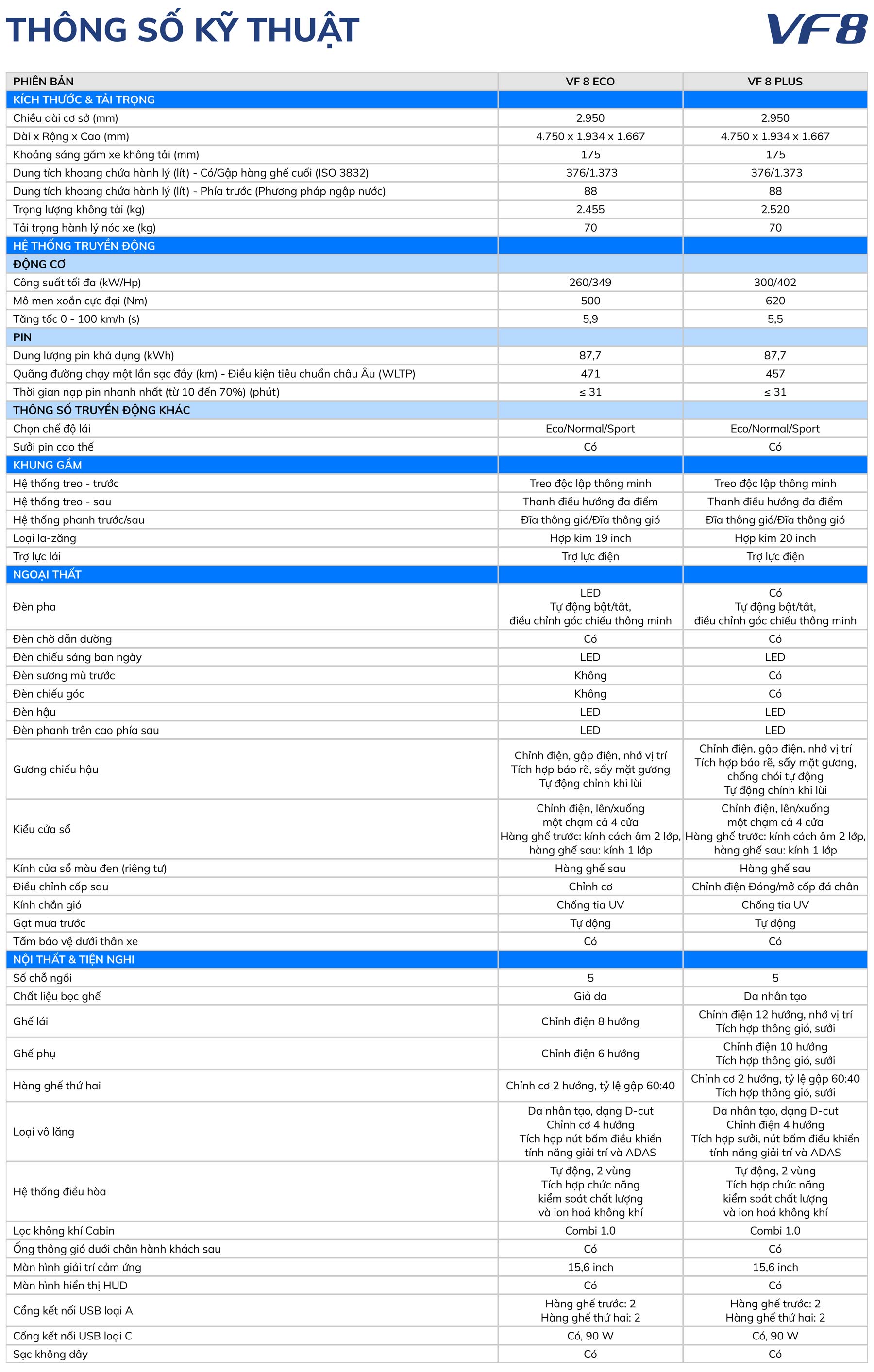 VinFast VF 8 với thiết kế mới sang trọng và công nghệ vượt trội. Với nhiều điểm nổi bật: ngoại thất nhiều màu, công nghệ trợ lý ảo Vivi 2.0 mới, ADAS và VF Connect. VinFast VF 8 có hai tùy chọn là phiên bản VF 8 Eco và phiên bản VF 8 Plus, trong đó phiên bản VF 8 Eco được trang bị động cơ điện có công suất 350 mã lực, đi được quãng đường 471km/lần sạc đầy, trong khi phiên bản VF 8 Plus có sức mạnh lên tới 402 mã lực, đi được quãng đường 457km/lần sạc đầy.